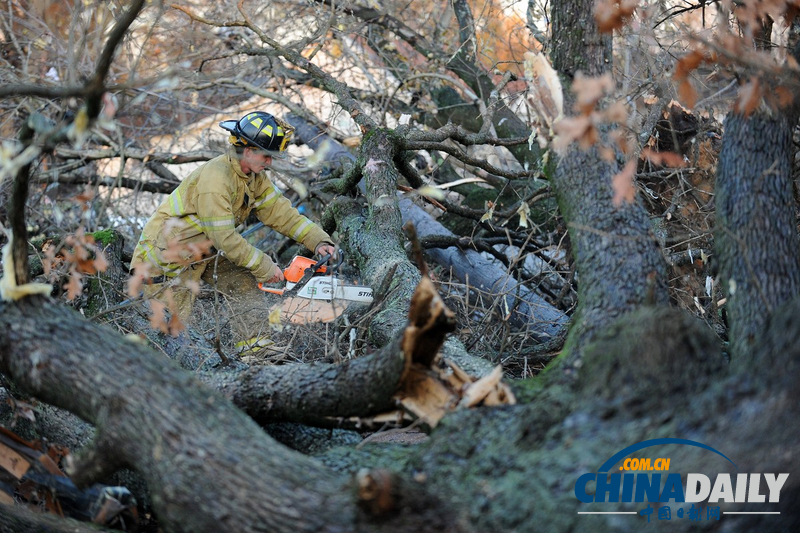 当地时间2013年11月17日,美国伊利诺伊州布鲁克波特市,一名消防人员在清除一棵倒在路中间的树木。(图片来源:东方IC)