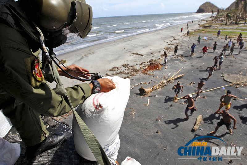 菲律宾空军向台风灾区投掷粮食 灾民奔跑抢夺