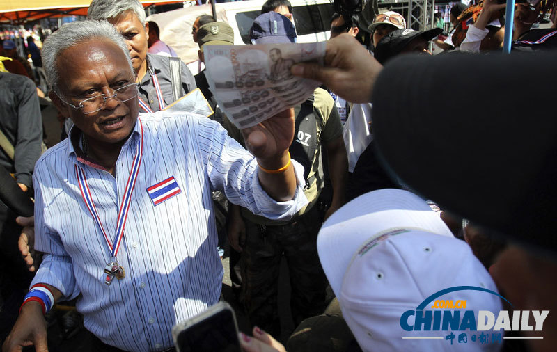 当地时间2014年1月14日,泰国曼谷,反对派发起的“封锁曼谷”行动进入第二日,示威者开始冲击政府各部门和机关大楼。图为素贴接受支持者捐款。(图片:东方IC)