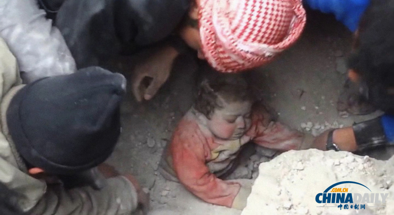 叙利亚一14个月女婴身陷战乱废墟中 被民众救出
