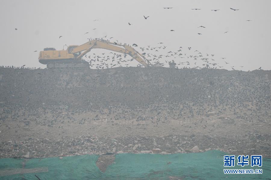 2014年2月25日,北京北神树卫生填埋场内,数以千计以垃圾为生的鸟密密麻麻地栖落在没有覆盖的垃圾山山顶,时不时一哄而起,黑压压一片。该填埋场1997年投入使用,设计日处理垃圾能力980吨,设计使用寿命13年。然而直到今天,每天还有超过千吨来自北京中心城区的垃圾运到这里,再由专门的大型垃圾车缓缓地送上离地数十米高的垃圾山,实施填埋作业。截至2013年末,北京市常住人口已达2114.8万人,其中常住外来人口802.7万人。多年来,北京市常住人口以年均增长五六十万人的速度发展,相当于每年增加一个中等城市。庞大的人口规模,令大城市像一个气喘吁吁的“肥胖症”患者。北京人口增长与资源、环境矛盾突出,环境污染、交通拥堵、教育医疗资源紧张等“大城市病”困扰着市民生活。面对人口资源环境矛盾这个躲不开、绕不过的发展难题,北京贯彻十八届三中全会《决定》中“严格控制特大城市人口规模”的政策,出台“以业控人”、启动低端产业转移外迁等措施,遏制城市过度扩张,逐步摸索医治“大城市病”的良方。 2014年北京将重点启动中心城小商品交易市场整治和外迁工作,带动人口的分流。包括动物园批发市场在内的四大商业交通堵点治理已开始进行前期工作。有关专家认为,城市调控人口必须采取“功能疏解”和“市场调控”手段并行,成为标本兼治的长效策略。新华社记者 罗晓光 摄