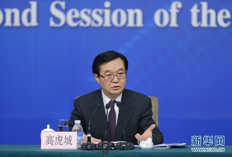 3月7日上午,十二届全国人大二次会议新闻中心举行记者会,邀请商务部部长高虎城就“商务发展与对外开放”的相关问题回答中外记者的提问。新华社记者邢广利 摄