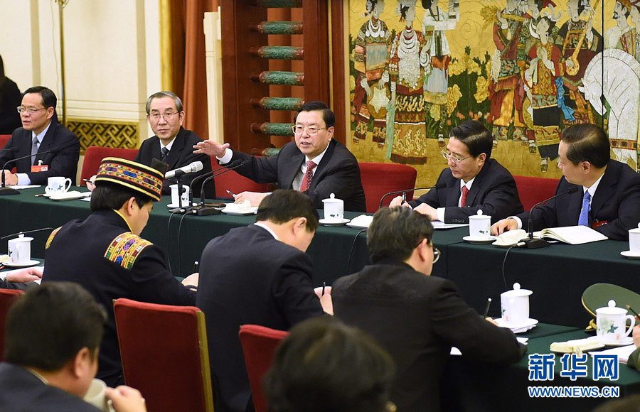 3月9日,中共中央政治局常委、全国人大常委会委员长张德江参加十二届全国人大二次会议广西代表团的审议。新华社记者刘建生摄