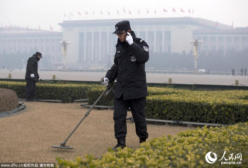 “两会”安保利器:金属探测器2014年3月3日,北京,2014年全国两会在北京举行。中国人民政治协商会议第十二届全国委员会第二次会议在北京人民大会堂开幕。安保人员手持金属探测器在北京天安门广场、人民大会堂周遭探测检查。