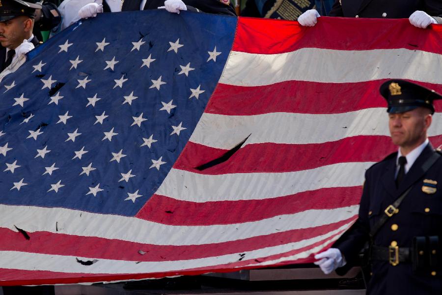 9月11日,纽约警察和消防员在美国纽约世贸中心“零地带”举行的“9·11”事件十周年纪念活动上展示一面当年被损坏的美国国旗。新华社记者朱炜摄