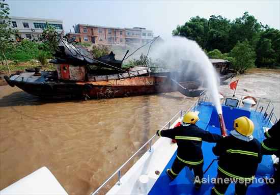 Firefighters put out a blaze caused by an explosion on a ship on the Yangtze River in Jiujiang, East China's Jiangxi province, Aug 12, 2010. The blast occurred about 7:30 am when the ship, which was used to collect waste oil, was docked by the riverbank, cracking the walls of a nearby house and damaging the windows of four other houses. No casualties were reported. The cause of the blast is not yet known, as the owner of the ship fled the scene soon after the incident. [Photo/Asianewsphoto]