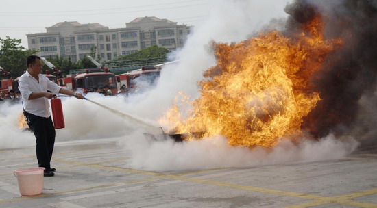 A man practises how to use a fire-extinguisher in Haikou, captial of South China's Hainan province on Tuesday Nov 9, 2010, as part of China's 10th National Fire Prevention Day campaign. [Photo/Xinhua]