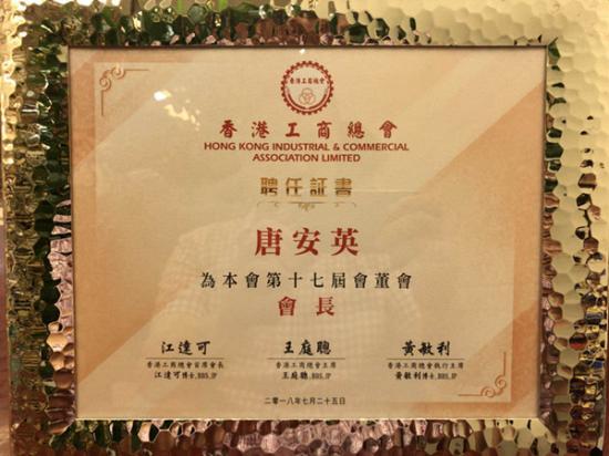 今年国庆前夕,香港会议展览中心,一派节日气氛。香港工商总会庆祝中华人民共和国成立69周年暨香港工商总会第十七届会董会、筑福香港基金会第二届理事会就职典礼在这里隆重举行。当川籍港商唐安英女士从香港特区行政长官林郑月娥手中,接过香港工商总会第十七届会董会会长的聘任证书时,在四川和香港奔忙的多年的她,泪水瞬间盈满眼眶。是啊,万里长江归大海,多年来是长江养育了她,是大海壮大了她,川港两地,有她的汗水与泪水,也记录下了她的几多家国情怀……