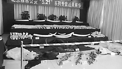 The Beijing Forest Police Bureau displays its seizure of smuggled wildlife parts on Monday. Provided to China Daily |