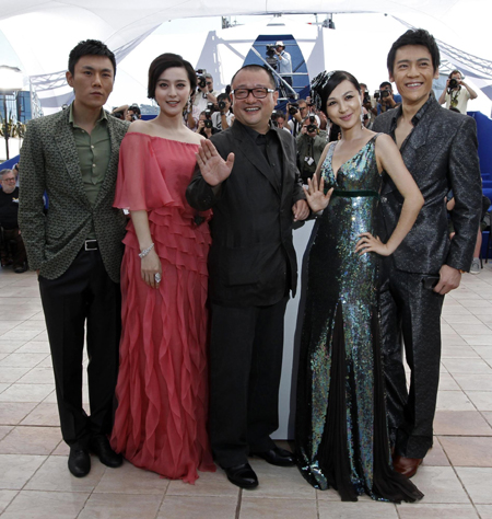 Actors Zi Yi (L), Li Feier (2nd L), director Wang Xiaoshuai (C), actors Fan Bingbing (2nd R) and Qin Hao (R), pose during a photocall for the film "Rizhao Chongqing" (Chongqing Blues) at the 63rd Cannes Film Festival May 13, 2010. Nineteen films are competing for the prestigious Palme d'Or which will be awarded on May 23.[Agencies]