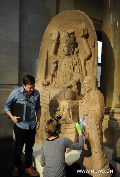 Researchers examine replicas of ancient sculptures from the Dazu Rock Carvings, a world heritage site of southwest China's Chongqing Municipality, at the National Museum Wales in Cardiff, Britain, Jan. 25, 2011. Forty-eight rock carvings from Dazu, mostly dating from the 9th to the 13th century, will be displayed at the museum from Jan. 26 to April 3, the first time of the Dazu rock carvings to be displayed outside China. Started in the middle of the 7th century, the Dazu Rock Carvings are made up of 75 protected sites containing some 50,000 statues, and were listed as a World Heritage Site in 1999. [Xinhua/Zeng Yi] |