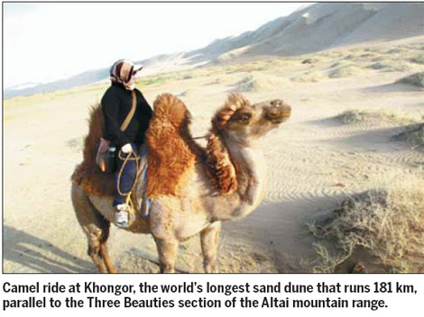 Two things happen, at once, at Khongoryn Els. Driving southwest for about 200 km, as soon as we cross to the southern side of the dark hills, a blistering wind overpowers us. A gray range stretching into the distances is etched against a darker, taller ridge in the background. The former, Khongor's chief attraction, is arguably the world's longest sand dune stretching for 181 km. The latter is the famed Three Beauties section of the Altai mountain range. The dunes are supposed to "sing" - to the discerning ear - but all we can hear is a mad wind hissing and rattling the windowpanes.