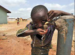 A boy drinks from a water tap in a 'new town' in Koidu, which suffered some of the worst ravages of Sierra Leone's war in the 1990s. Issouf Sanogo / Agence France-Presse |