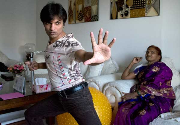 Chaudhari Dilip Giridhar shows his kung fu moves at his rented apartment in Beijing. Katherine Rodriguez / for China Daily |