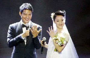 Chinese actor Lu Yi and his daughter Bei Er appear at a theater show at the National Stadium in Beijing.[news.cn/ent]
