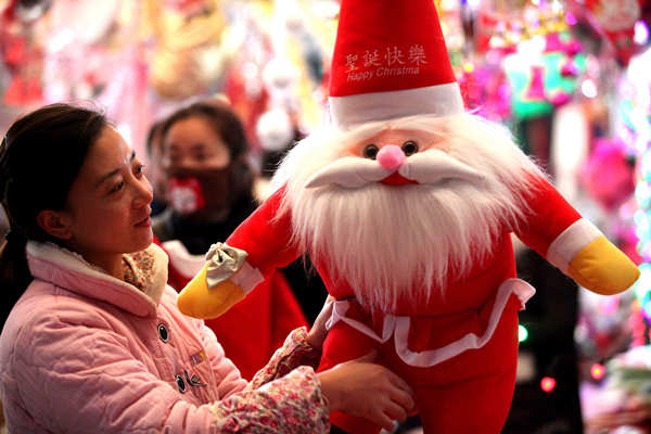 A customer chooses a doll for Christmas at a market in Bozhou, Anhui province. [Photo by Liu Qinli/China Daily]