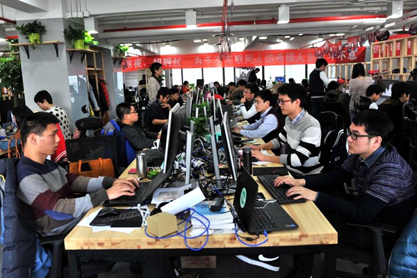 Lagou.com staff work hard in an office in Beijing's Zhongguancun, on Dec 19, 2014. [Photo/Xinhua] |