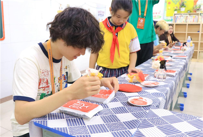The students try their hands at the folk art of paper-cutting, allowing them to feel the charm of the ancient city. [Photo by Xuan Jiarui for chinadaily.com.cn]