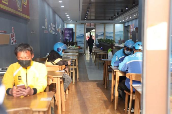 Delivery riders take a break at the resting area. [Photo by Wei Wei/For chinadaily.com.cn]