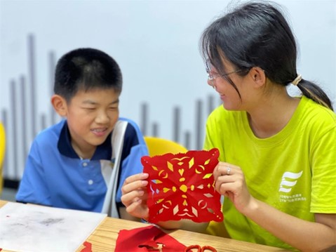 A volunteer helps a boy fold and cut paper to create intricate designs. [Photo by Wang Meijiao for chinadaily.com.cn]