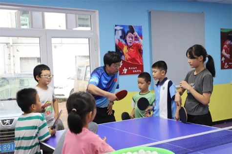 A volunteer coaches a group of kids at a table tennis training session. [Photo by Wang Meijiao for chinadaily.com.cn]