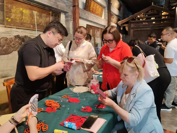 Foreign visitors experience paper-cutting during their tour of the Traditional Family Culture Park of China in Ningiin. [Photo provided to chinadaily.com.cn]