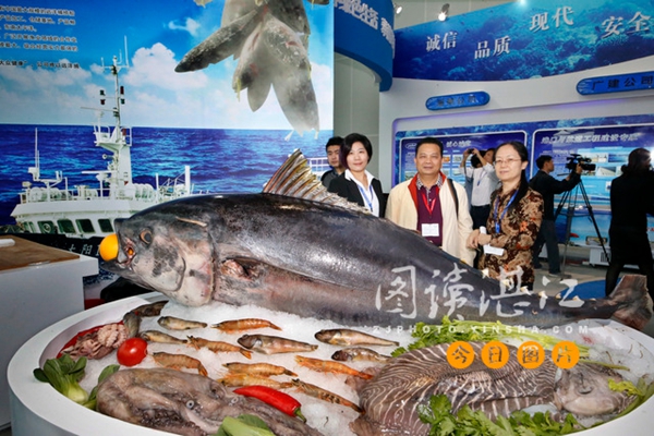 A great variety of seafood products are on display at the 2015 China Marine Economy Expo in Zhanjiang on Nov 26. [Photo/yinsha.com] |
