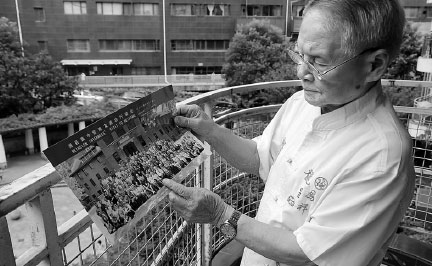 Wang Chenghan shows a photo of survivors of the Weihsien camp in Shandong province. In 1945, he joined a rescue operation in the Japanese interment camp.