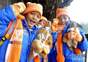 Volunteers from the commonwealth organization in Congjiang county Qiandongnan Miao and Dong autonomous prefecture donated hats, gloves and warm clothes to the students at the county’s Baiye Primary School.