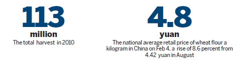 Analysts expect the wheat harvest to decline by 2 million to 10 million tons this year; the 2010 harvest totaled 113 million tons. The drought is ramping up the price of wheat, which is having an impact both domestically and abroad, according to a report from the UN's Food and Agriculture Organization. The national average retail price of wheat flour in China was 4.42 yuan (66 cents) a kilogram in August and 4.8 yuan on Feb 4, a rise of 8.6 percent.
