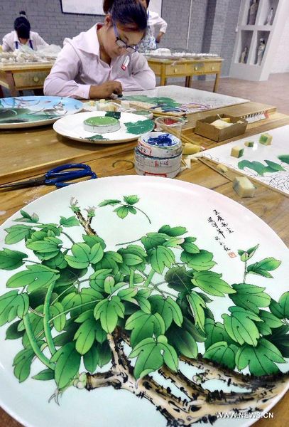 Workers make porcelain handicrafts at Datang royal porcelain museum in Luoyang, central China's Henan Province, Sept. 19, 2013. Besides the collection and exhibition of porcelains, the museum also inherits and develops the way of porcelain making in Tang Dynasty (618-907). (Xinhua/Wang Song)