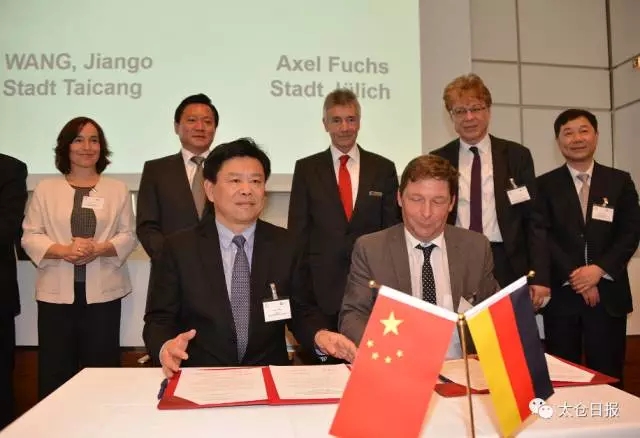 At the event, Wang and Jülich's mayor Axel Fuchs signed a document twinning the cities and promising cooperation on business transactions, R&D, culture, and education.