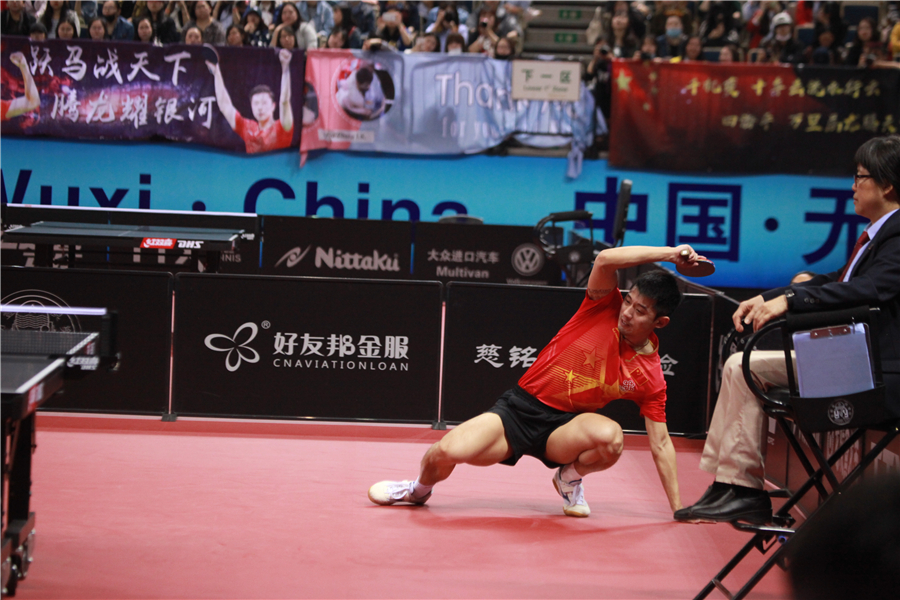 Grand Slam Champion Zhang Jike, lunges to strike back during a fierce rally at 2017 Asian Table Tennis Championships in Wuxi, Jiangsu province, during his battle against Japan's Oshima Yuya on April 14. [Photo/chinadaily.com.cn]