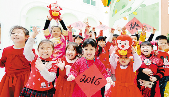 Kindergarteners hold up paper-cut blessings and monkey dolls to welcome the Year of Monkey Visiting a cinema in Shenyang during the Spring Festival holiday. [Photo/Xinhua]