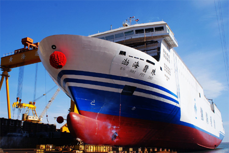 ![]() 中国日报网消息:2月1日上午11时18分,投资3.5亿元建造的大型豪华客滚船——“渤海翡珠”轮,在山东荣成黄海造船厂顺利下水。 “渤海翡珠”轮是渤海轮渡股份有限公司斥资20亿元建造6艘大型豪华客滚船中的最后一艘,也是中国自行设计、自行建造的具有国际先进水平的客滚船。 预计今年5月份这一滚装船将投入渤海湾运营。 据渤海轮渡股份有限公司总经理于新建介绍,“渤海翡珠”轮投入运营后,渤海轮渡公司将拥有7艘“珠”字号、2艘“华”字号共9艘大型客滚船舶。总车道线14736米,总客位11191个,每天可往返18个航次、可运送车辆3000多辆次、运送旅客20000多人次。预计年运送车辆可达70万辆次以上,占渤海湾车辆吞吐总量的70%以上,旅客吞吐量可达300万人次以上,占渤海湾旅客吞吐总量的50%以上。 成功的运力更新,给企业带来了巨大的经济效益和良好的社会效益。渤海轮渡股份有限公司2009年实现利润总额2.38亿元,上缴税金1.9亿元。 于新建总经理说,公司将再投资15亿元建造四艘国际豪华客滚船,这四艘船舶的设计方案已报中国船级社审核,主要设备都订购完毕,今年上半年正式开工建造,2011年下半年第一艘船交付使用,2013年上半年全部投入运营。 这四艘国际豪华客滚船建成后不仅可经营国内客滚运输航线,而且可以满足对韩国、日本、台湾以及欧美客滚航线的经营。渤海轮渡公司还计划斥资数十亿元建造国际豪华邮轮,发展近洋国际旅游。已于1月15日与中国船级社、上海船舶研究设计院、黄海造船有限公司共同签订了《国际豪华邮轮研发项目合作备忘录》,正式启动研发国际豪华邮轮项目。豪华邮轮将于2012年开工建造,预计2015年交付使用。
