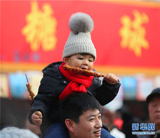 A boy eats tangqiu (sugar-coated haws on a stick) atop his father's shoulders at the fair in Qingdao's Shibei District, Feb 5, 2017. [Photo/Xinhua]