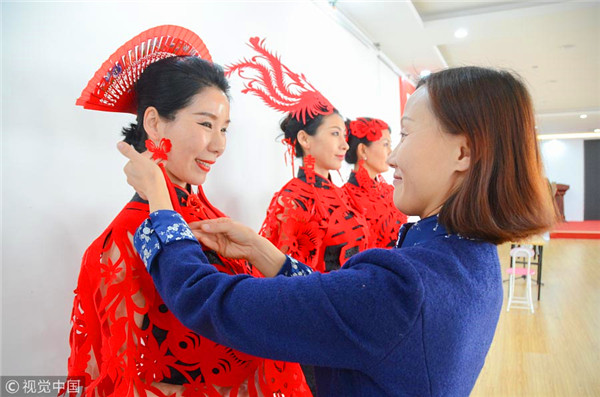 Liang Ying (right) dresses models with her paper-cut accessories on Feb 4, 2018. [Photo/VCG] |
