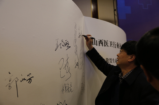 The attendees of the first China Shanxi Summit of the Social Responsibility of the Health Sector sign the Social Responsibility Convention on Dec 18. [Photo/Xinhua]