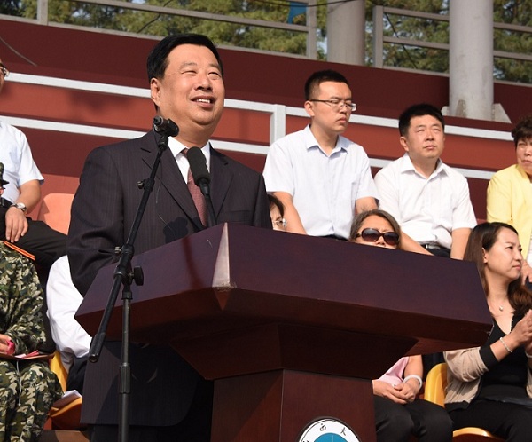 Chancellor Jia Suotang addresses a convocation welcoming freshmen at Wucheng Campus of Shanxi University in Taiyuan on Sept 14, 2017. [Photo/sxu.edu.cn] |