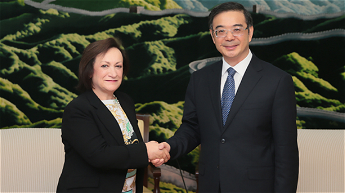 Du Wanhua, a member of the judicial committee with the Supreme People’s Court met with the visiting judicial delegation from the state of Berlin, Germany, led by Alexander Straßmeir on May 3 in Beijing.