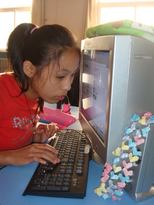 Photo taken by Zhao Congrui shows that Wang Bocong, a visually-impaired girl, takes computer class in Tianjin School for the Visually Impaired in Tianjin, north China, Oct. 28, 2009. Ten-year-old Zhao Congrui is a student of 5th grade in the Affiliated Primary School of Tianjin Normal University. She is a young reporter of a local newspaper and some of her articles were published. Her father always works out of town so she has the chances to take lots of photos every time when she travels to see her father, which leads to her falling in love with photography. Her mother has taken her to take part in varied activities for commonweal since she was a kid in kindergarten. Therefore she often focuses on people in welfare organizations and schools for the disabled with her camera.