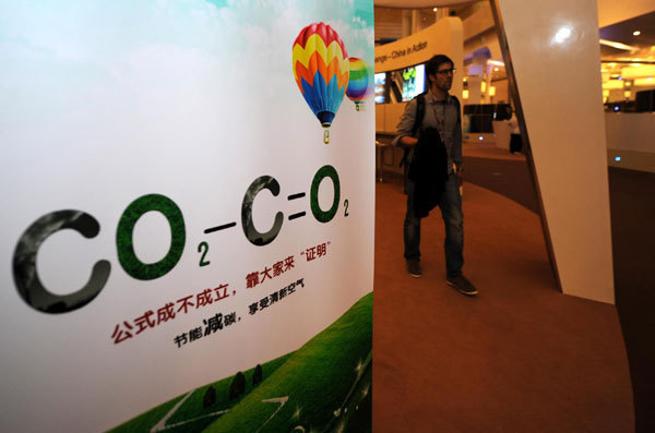 A poster is displayed to raise the awareness of cutting carbon emission on Oct 3. [Photo/Xinhua]