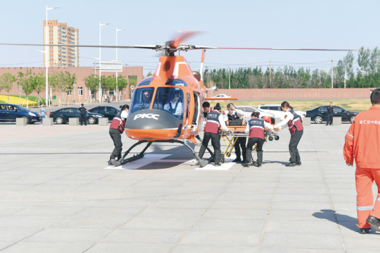 An emergency air rescue drill was conducted by the Health and Family Planning Commission of Liaoning Province, China Medical University, and Shanghai Kingwing General Aviation Co in Shenyang, on May 9.