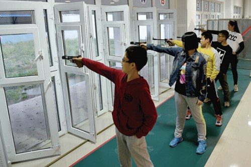 Teenagers practice 25-meter pistol shooting at the Karamay Shooting Range Hall. [Photo/epaper.kelamayi.com.cn] |
