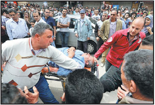 A victim is seen on a stretcher after a bomb went off at a Coptic church in Tanta, Egypt, on Sunday.Reuters |