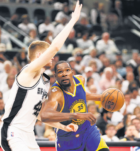 Golden State Warriors' Kevin Durant drives past Davis Bertans of the San Antonio Spurs during the second half of Saturday's Game 3 of their NBA Western Conference final at AT&T Center in San Antonio, Texas. Durant had 33 points to pace the Warriors to a 120-108 win. Soobum Im / Usa Today Sports |