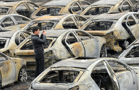 A man takes photos of burnt cars in a parking lot in Zhengzhou city, capital of Central China’s Henan province, on March 12, after more than 70 cars - including 30 Cadillacs - with a total value of 20 million yuan ($3,260,000), were destroyed in a fire.