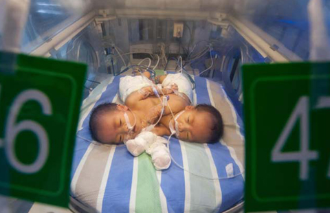 Infant conjoined twins lie fast asleep in an incubator at a hospital in Chongqing, but outside the ICU, their father Yu Xiaojiang paced back and forth and could not find peace.