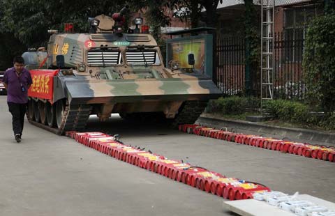 A tank was used to destroy fake fire fighting equipment in Foshan, Guangdong province, March 18, 2014.