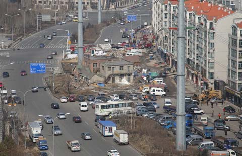 "Nail houses" have occupied a road for three years in Harbin city, Heilongjiang province, March 22, 2014.